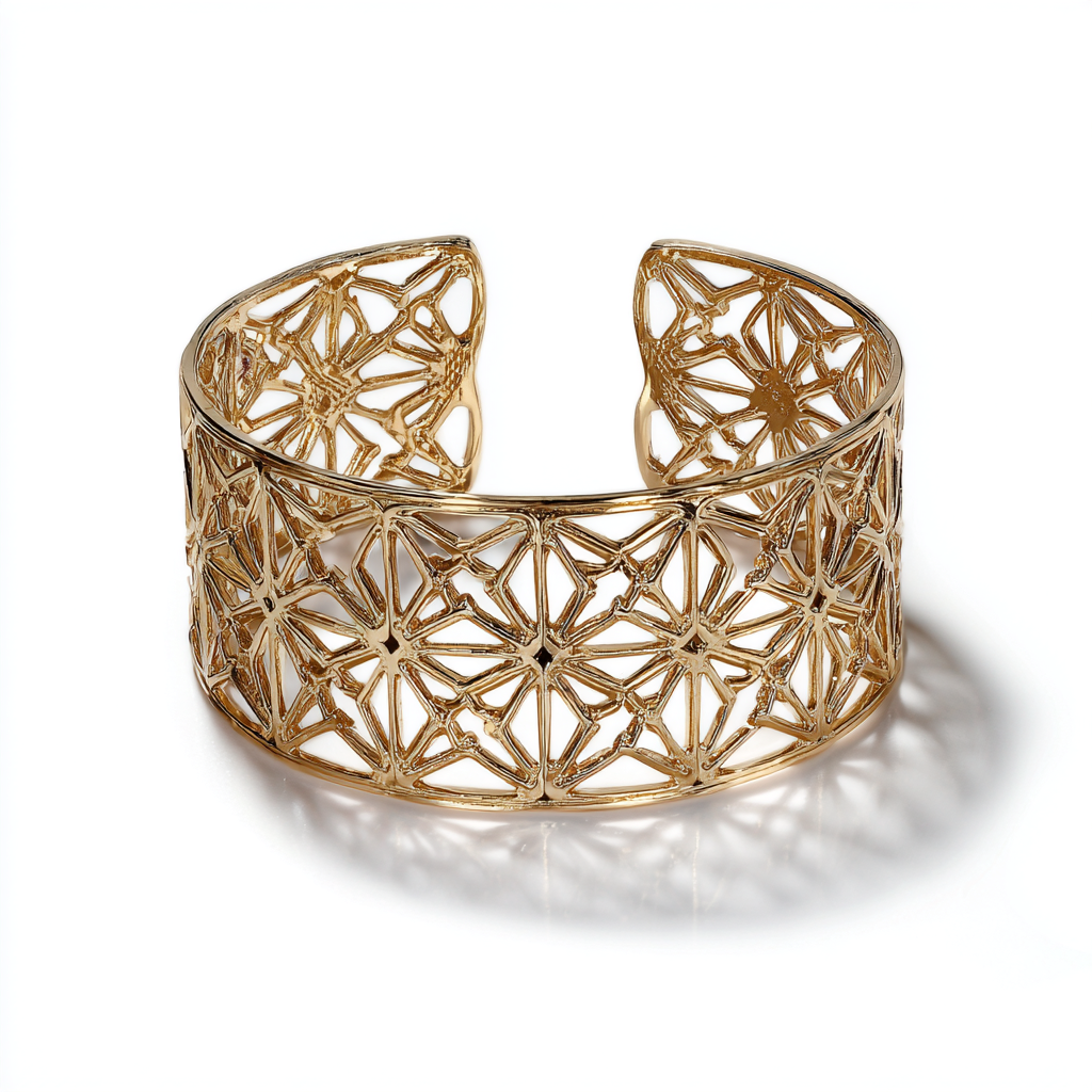 A sculptural ode to modern elegance.The Luce Geometrica Cuff is crafted with an intricate openwork design that captures light from every angle, creating a soft architectural glow against the skin. Its geometric silhouette feels bold yet weightless — a refined balance of structure, airiness, and modern minimalism. Handcrafted from solid...