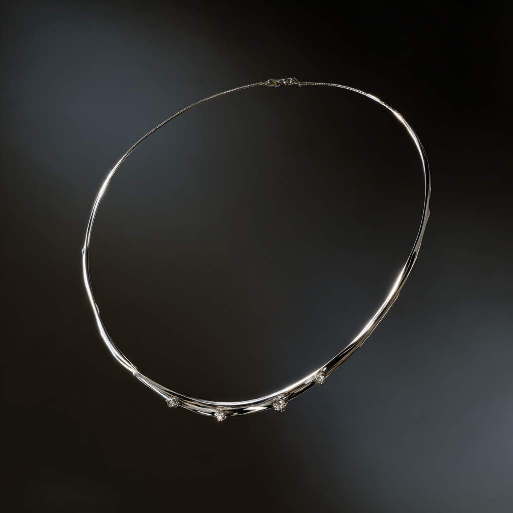 Sleek, sculptural, and luminously refined — the Luna Lineare Necklace captures the purity of a moonlit line gracefully curving along the neckline.