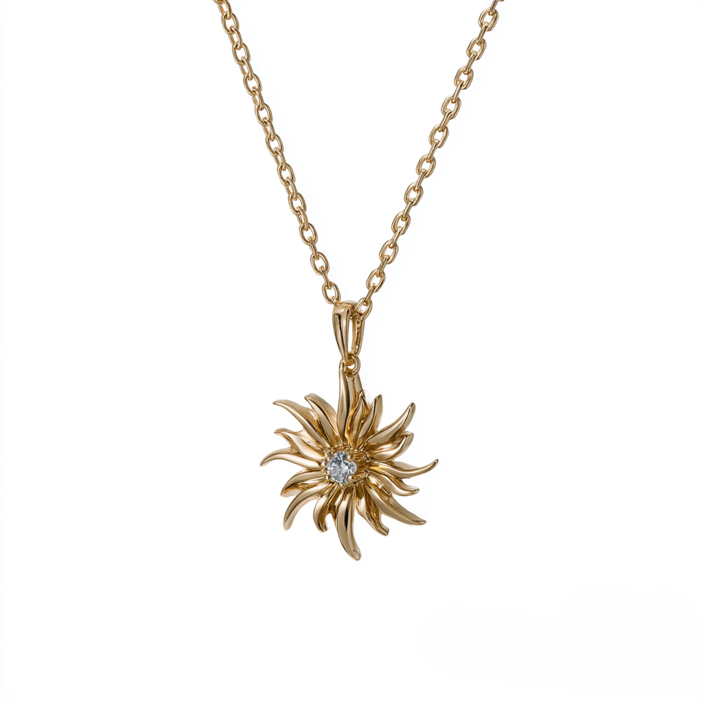 Hand-formed in polished 18K gold, each sunbeam curves with fluid precision around a brilliant central zircon, creating a dynamic play of light and movement.