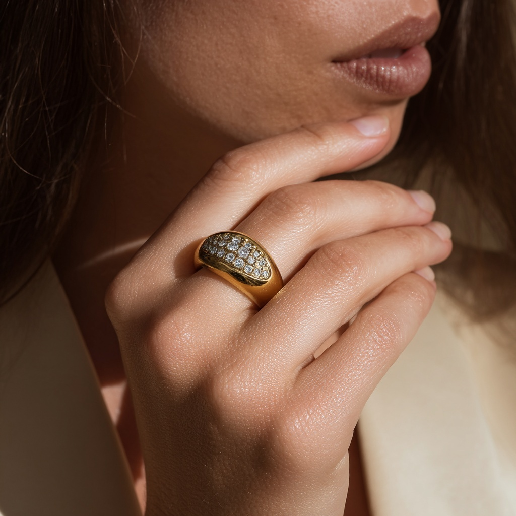 Bold yet refined — a luminous statement of quiet luxury.The Luce Pavé Dome Ring radiates timeless elegance through its smooth, sculptural silhouette.Handcrafted in solid 925 sterling silver and coated with a thick layer of 18K gold vermeil, the dome design is fully illuminated with pavé-set AAA cubic zirconia that capture...