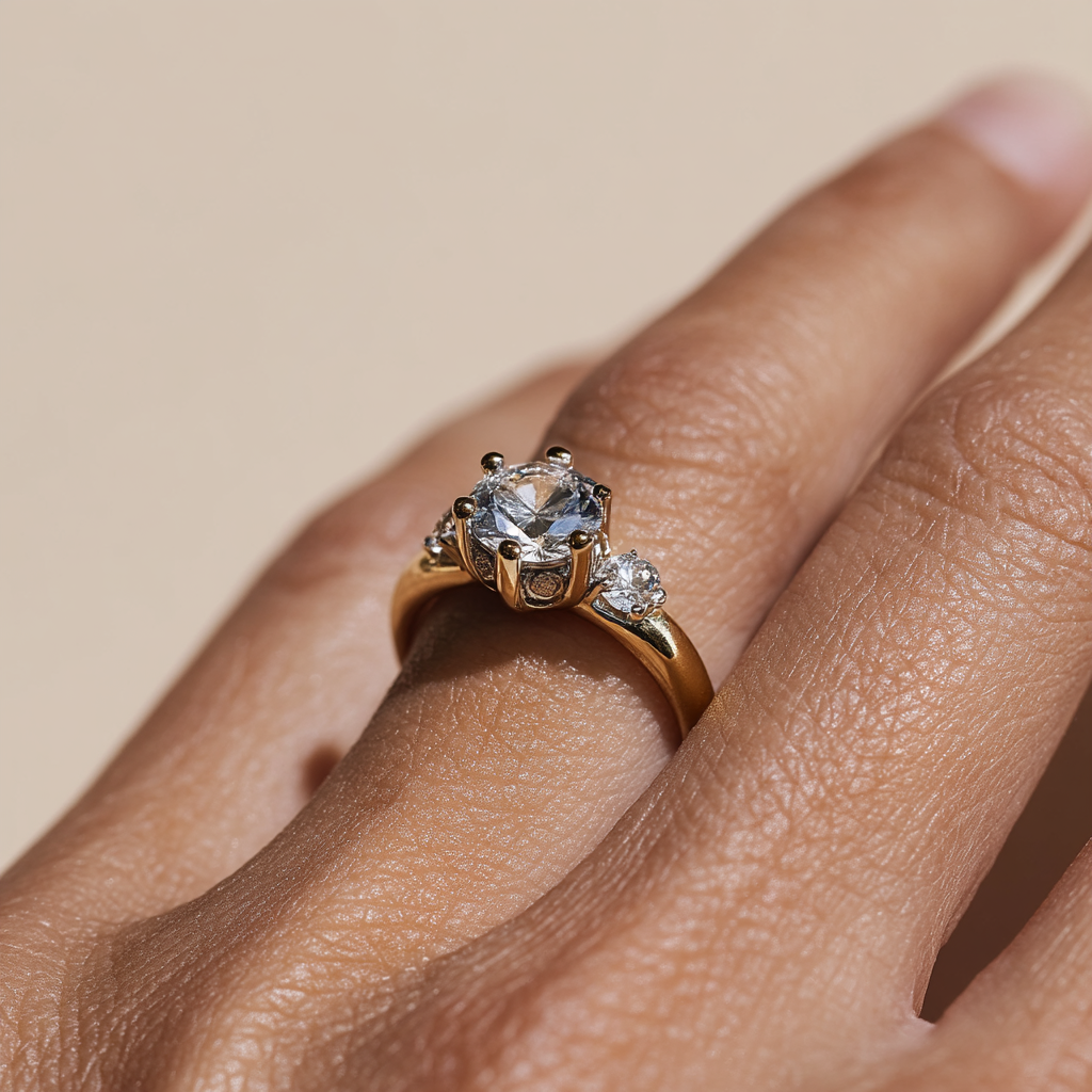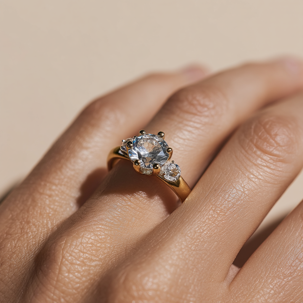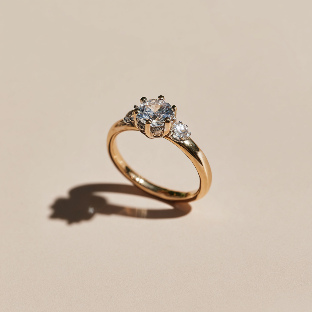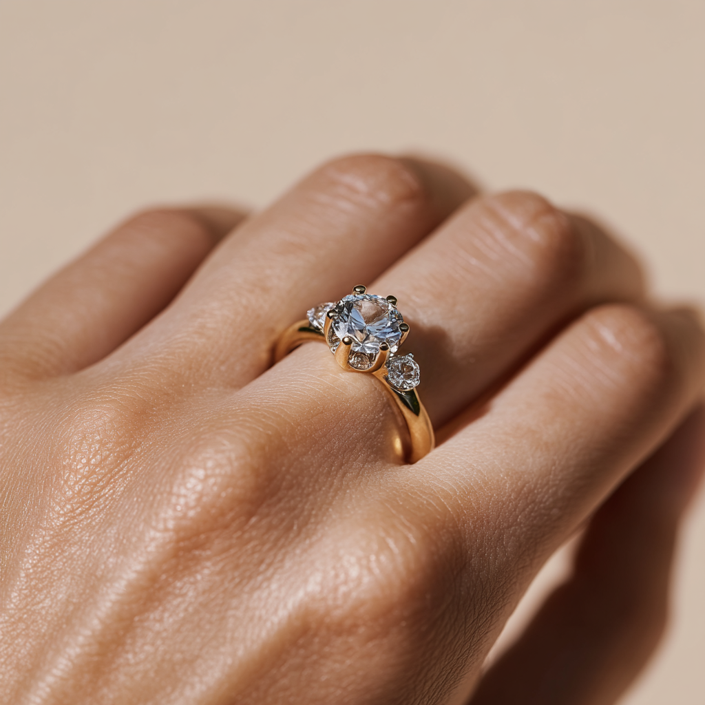 The Triluce Ring symbolizes past, present, and future through its elegant arrangement of three radiant stones.
